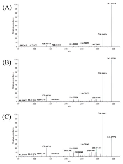 MS/MS spectra of Etizolam under different collision energies. (A) Average NCE value: 40; (B) average NCE value: 50; and (C) average NCE value: 60.