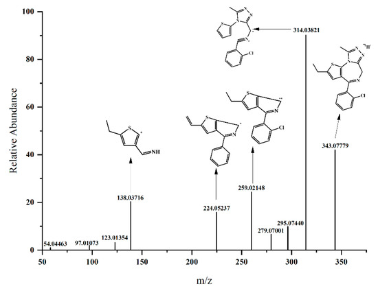 The analysis of characteristic fragments of the original drug is of great significance for the structural analysis of related metabolites. Etizolam was eluted at 19.70 min (m/z 343.07779, C17H15N4ClS) (Figure 2) and generated four characteristic fragment ions after fragmentation: (1) m/z 314.03821 (C15H11N4ClS) (elimination of the ethyl group on the thiophene ring and rearrangement of the diazepine ring); (2) m/z 259.02148 (C14H11NClS) (elimination of the imidazole ring and part of the diazepine ring); (3) m/z 224.05237 (C14H10NS) (elimination of the imidazole ring and part of the diazepine ring, and the ethyl group becomes a vinyl group); and (4) m/z 138.03716 (C7H8NS) (elimination of the chlorobenzene ring, imidazole ring, and part of the diazepine ring).