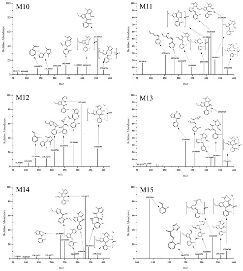 The [M H]+ values of M10, M11, M12, M13, M14, and M15 were 375.06770 (Figure 6), indicating that dihydroxylation reaction had occurred with an increase of 31.99017 Da compared to the parent drug [M H]+. Fragment ions were generated at m/z 357.05 (Figure 6) in M10, M11, M13, and M15, suggesting that one hydroxyl group was attached to a carbon atom ③ (Figure 5) of Etizolam. In contrast, the other hydroxyl group was attached to positions ①, ②, ④, and ⑤ (Figure 5). M11 generated a hydroxylation fragment ion at m/z 307.02996, eliminating the possibility of the other hydroxyl group attaching to a carbon atom ④. M12 and M14 generated ion fragments at m/z 282.06680 and m/z 341.06161, respectively, indicating that the imidazole ring did not undergo a ring-opening rearrangement, and the possibility of hydroxyl groups attaching to the imidazole ring was low. Therefore, the two hydroxyl groups were most likely attached to positions ①, ②, ④, and ⑤ (Figure 5).