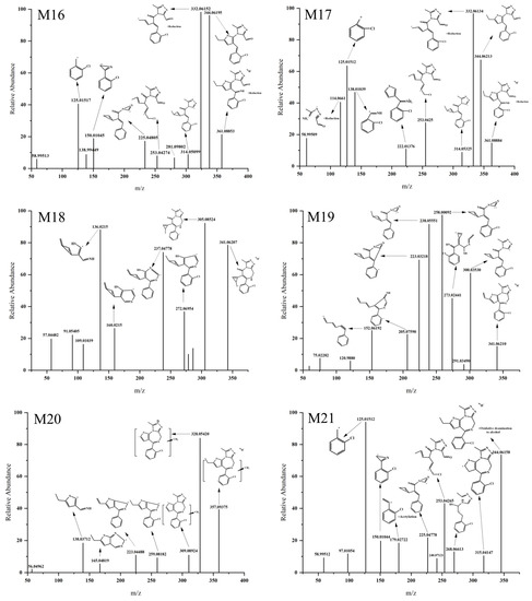 The [M H]+ values of M16 and M17 were 361.088 (Figure 7), which is 18.01047 Da larger than that of the parent drug, indicating the occurrence of a hydration reaction. The ion fragments were produced at m/z 344.06, m/z 332.061, and m/z 314.05 in M16 and M17. Based on the MS/MS spectra of M16 and M17 (Figure 7), it can be inferred that the hydroxyl group in the hydration reaction was bonded to the carbon atom in the diazaphenanthrene ring, followed by a ring-opening and rearrangement to form an aldehyde group. It is worth noting that the difference between M16 and M17 lies in the different positions of hydrogen atom reduction. M16 did not produce fragment ions at m/z 253.0425. However, it produced a fragment ion peak at m/z 332.06152, indicating that the hydrogen atom reduction most likely occurred at the carbon–oxygen double bond of the aldehyde group. M17 produced a fragment ion peak at m/z 114.0661, suggesting that the reduction position of the hydrogen atom was at the double or triple bond in the fragment ion at m/z 114.0661.