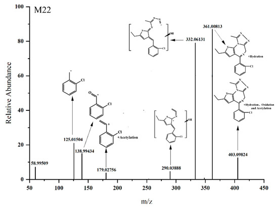 The [M H]+ value of M22 was 403.09824 (Figure 8), which is 60.02071 Da larger than that of the parent drug, suggesting the occurrence of hydration and acetylation reactions. Based on the ion fragment at m/z 179.02756, it is speculated that the acetylation site is located on the phenyl ring. Combined with the ion fragments at m/z 361.00813 and m/z 344.06152, it is inferred that the hydration reaction occurred inside the diazaphenanthrene ring, and according to the structure at m/z 344.06152, the hydration reaction most likely occurred at the carbon–nitrogen double bond in the diazaphenanthrene ring.