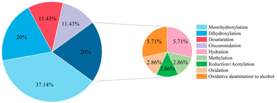 Based on the experimental results, 29 metabolites were identified in Etizolam’s in vivo and in vitro metabolism models in zebrafish and human liver microsomes, involving 9 metabolic pathways. The metabolic pathways involved in the 29 metabolites in Table 2 were analyzed and statistically summarized (Figure 9). The results showed that metabolites involving hydroxylation reactions (including monohydroxylation and dihydroxylation) had the highest proportion, accounting for approximately 57.1% of the total potential metabolites. The reasons for this are twofold: (1) the structure of Etizolam provides multiple hydroxylation binding sites (Figure 5), and hydroxylation can generate stable hydroxylated metabolites after binding to these sites; (2) the presence of the Cytochrome P450 enzyme system (CYP450) makes hydroxylation reactions easier to occur. CYP450 is a heme-containing monooxygenase that activates molecular oxygen, allowing one oxygen atom to bind to an organic molecule while reducing the other to water. When Etizolam enters zebrafish and human liver microsomes, the catalytic action of CYP450 accelerates the formation of OH-Etizolam. Notably, compared with the metabolism studies of other designer benzodiazepines [25,26,27,28,29], three new metabolic pathways were identified: oxidative deamination to alcohol, reduction acetylation, and desaturation. The analysis suggests that these three metabolic pathways are strongly related to Etizolam’s structure, which is a derivative of thienodiazepine and has a thieno ring that replaces the benzene ring in the traditional nucleus of benzodiazepines, resulting in significant changes in its pharmacological properties. Based on the response values of each metabolite, monohydroxylation (M1), desaturation (M19), and hydration (M16) were recommended as potential biomarkers for Etizolam metabolism.