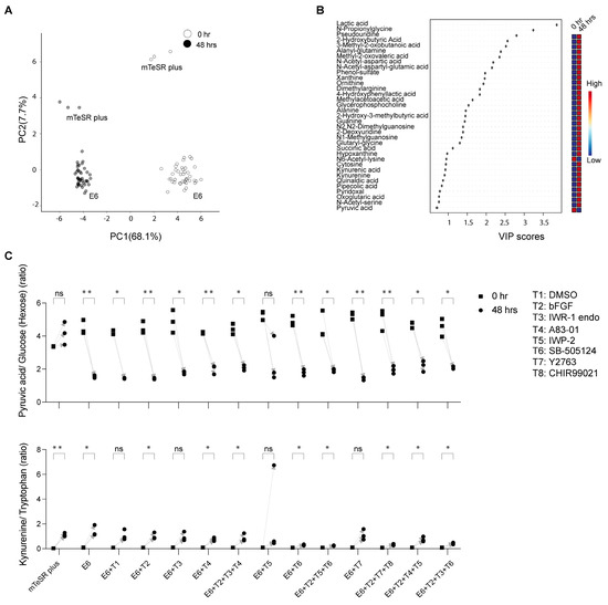 Temporal analysis of extracellular metabolites from the hiPSC-585A1 at 0 h and 48 h. (A) Principal component analysis (PCA) of metabolomics dataset peak areas where samples at 0 h and 48 h are highlighted in different colors. (B) Variable importance in projection (VIP) derived from the partial least square discrimination analysis (PLS−DA) that included all samples for the selection of important metabolites. All cell culturing conditions of hiPSCs used in this study are included in PCA and VIP plots as described in Table 1 (mTeSR plus medium, E6 alone as well as in combination with additives (T1 to T8)). (C) Representative examples of selected metabolites were analyzed by calculating their peak area ratios, such as pyruvic acid to glucose and kynurenine to tryptophan. Data are derived from three biological replicates. The p−values were determined using a paired t−test (48 h against 0 h), with a significance level of * p < 0.05 and ** p < 0.01. No significant difference was noted for metabolites with a p-value of “ns”.