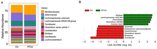 Figure 1. PFOA altered the composition of the gut microbiota. (A) Abundant microbial genera detected in control and PFOA-treated mice. (B) Microbial genera significantly altered by PFOA exposure, as revealed by LEfSe analysis.