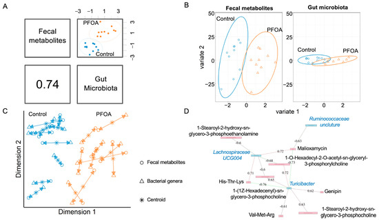 Linear discriminant analysis effect size (LEfSe) was used to determine the bacterial genera that were most likely to explain the differences between the PFOA and control groups [29]. For the comparison of metabolites, the Mann−Whitney U test was used to calculate the p-values between the PFOA and control groups. The false discovery rate was used to correct the multiple comparisons. Metabolites with a p-value < 0.05 were considered significant. Partial least squares discriminant analysis (PLS-DA) and pathway enrichment analysis were performed using MetaboAnalyst 5.0 [30]. MixOmics was used for the integrative analysis of gut microbiota and fecal metabolites—this is an integrative framework for the multivariate analysis of omics data [31].