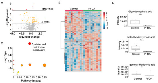 Figure 3. PFOA-disturbed fecal metabolites. (A) Volcano plot. Red dot: FDR < 0.05; Yellow dot: p-value < 0.05; Grey dot: p-value > 0.05. (B) Heatmap of fecal metabolites. (C) Pathway enrichment analysis of fecal metabolites. Red bubble with label: p-value < 0.05. (D) Boxplots of fecal glycodeoxycholic acid, beta-hyodeoxycholic acid, and gamma-muricholic acid. *: p-value < 0.05; ***: p-value < 0.001.