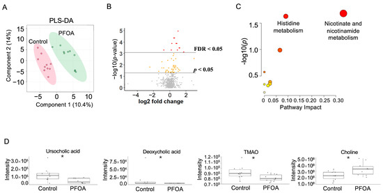 Figure 4. PFOA-disturbed serum metabolites. (A) PLS-DA plot for serum metabolites. (B) Volcano plot. Red dot: FDR < 0.05; Yellow dot: p-value < 0.05; Grey dot: p-value > 0.05. (C) Pathway enrichment analysis of serum metabolites. Red bubble with label: p-value < 0.05. (D) Boxplots of serum ursocholic acid, deoxycholic acid, TMAO, and choline. *: p-value < 0.05.