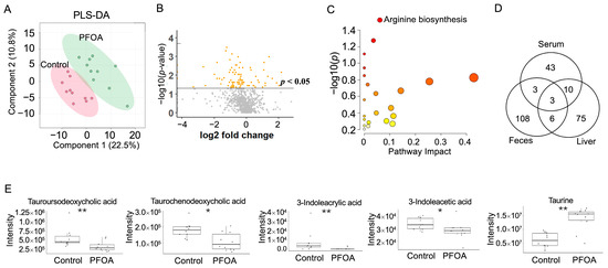 Figure 5. PFOA-disturbed liver metabolites. (A) PLS-DA plot for liver metabolites. (B) Volcano plot. Yellow dot: p-value < 0.05; Grey dot: p-value > 0.05. (C) Pathway enrichment analysis of serum metabolites. Red bubble with label: p-value < 0.05 (D) Venn diagram for significantly altered metabolites in feces, serum, and liver. (E) Boxplots of liver tauroursodeoxycholic acid, taurochenodeoxycholic acid, 3-indoleacrylic acid, 3-indoleacetic acid, and taurine. *: p-value < 0.05; **: p-value < 0.01.
