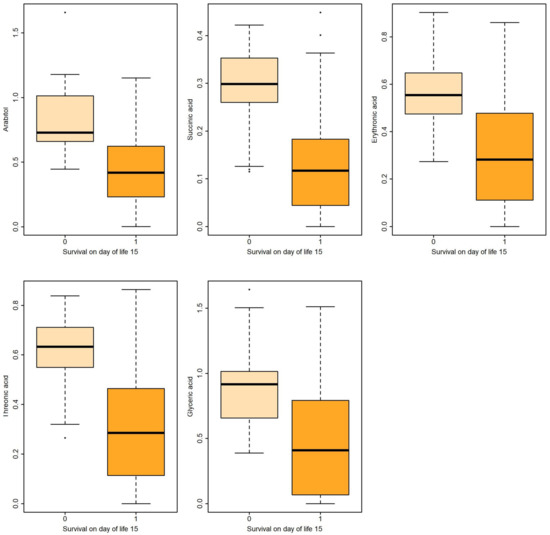 Boxplots of metabolites associated with survival on DOL 15 both in uni- and multivariable logistic regression.
