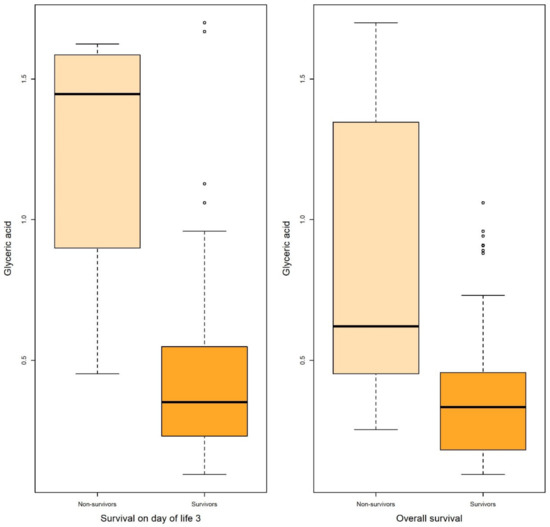 Boxplots of glyceric acid associated with survival on DOL 3 and overall survival in both uni- and multivariable logistic regression.