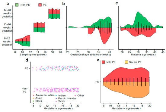 Comparisons of sample, maternal, and pregnancy characteristics for cases of PE and controls (non-cases) in the study cohort. In this study, we treated each longitudinal sampling as an independent analysis unit while considering the temporal gestational age association. Panel (a) shows the sample collection time across gestation, while panel (b) presents the gestational age at delivery of samples. Panels (c,d) illustrate the maternal characteristics of age, and race of the PE and non-PE urine sampling groups. Panel (e) shows the PE patients’ severity distribution in the PE urine samples.