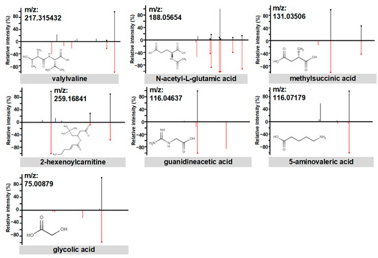 Among the identified metabolites, seven compounds were subjected to further analysis through LC-MS/MS profiling and reference compound matching analyses. These seven compounds, namely guanidineacetic acid, 2-hexenoylcarnitine, glycolic acid, valylvaline, methylsuccinic acid, N-acetyl-L-glutamic acid, and 5-aminovaleric acid, exhibited positive model importance in the XGBoost multivariate modeling analysis. The identity of these metabolites was confirmed through MS/MS analyses, comparing them with reference compound standards (Figure 5).