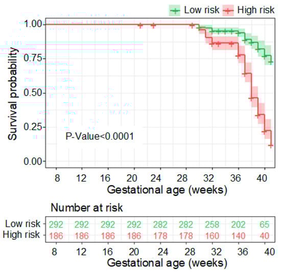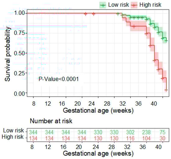 Kaplan–Meier analyses of deliveries of low- and high-risk PE pregnancies. The vertical axis (y-axis) displays the population proportion in the two risk subgroups who were not diagnosed with PE over time, and the horizontal axis (x-axis) displays the corresponding gestational age.