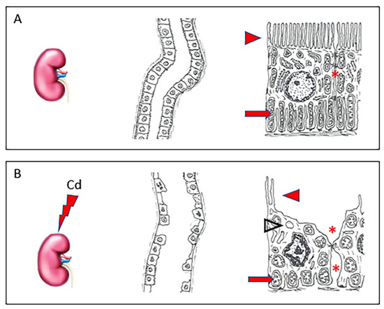 In a healthy kidney (A), tubules have normal architecture; their epithelium shows well-evident apical microvilli (arrowhead), elongated mitochondria (arrow), and tight intercellular junctions (asterisk). In kidneys challenged with Cd (B), tubules have evident morphological changes, as epithelial cells show short, few, or even absent apical microvilli (arrowhead), round or swollen mitochondria (arrow), and cytoplasmic vacuoles (empty arrowhead). Intercellular spaces are wide (asterisk).