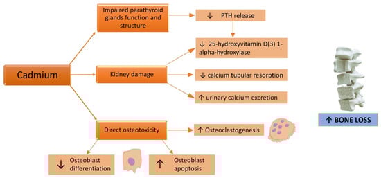 Osteotoxicity is a known effect of Cd [75]. In fact, the Itai-Itai disease, caused by a chronic exposure to Cd due to the use of Cd-polluted water to irrigate the rice fields [38], in addition to kidney failure, caused osteomalacia and osteoporosis. Skeleton fragility related to Cd exposure can be induced both by a direct Cd toxic effect on bone mineralization and by renal failure (Figure 2), even if the critical exposure levels and exact underlying mechanisms remain unclear [76].