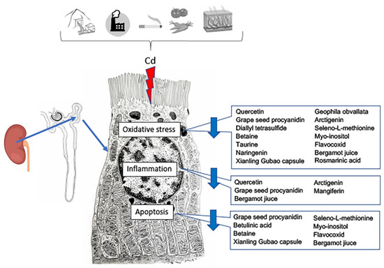 The molecular mechanisms of Cd-induced structural and functional damage to the kidney are a research topic of current interest. Experimental and clinical data analyzed in the present narrative review suggest that the multifaceted mechanism of action of nutraceuticals needs to be taken serious to effectively counteract the detrimental molecular cascade in kidney injury caused by environmental PTEs such as Cd.