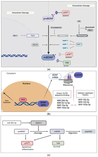 (a) Schematic representation of proteolytic pathways converting precursor proBDNF to its mature form mBDNF. (b) General illustration of BDNF ribosomal synthesis. Several miRNAs elicit direct and indirect inhibition of BDNF mRNA expression. Binding of BDNF and proBDNF to TrkB rand p75NTR receptors, respectively. (c) MiR-491-5p inhibition of MMP-9 implicated in the metabolism of BDNF. MiR, microRNA; TrkB, tyrosine kinase receptor B; PAI-1, plasminogen activator inhibitor-1; PC1/3, proprotein convertase 1/3; tPA, tissue plasminogen activator; TIMP-1, tissue inhibitor of metalloproteinase-1; mBDNF, mature brain-derived neurotrophic factor; MMP, matrix metalloproteinases; p75NTR, p75 neurotrophin receptor; UTR, untranslated regions; CREB, cAMP response element-binding protein. Figure (a,b) were created using BioRender.