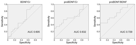 Receiver Operating Characteristics (ROC) curve for BDNF/creatinine and proBDNF/creatinine levels in urine samples. Area under curve (AUC) was computed for BDNF/creatinine (BDNF/Cr) (pg/mg creatinine), proBDNF/creatinine (proBDNF/Cr) (pg/mg creatinine), and the ratio proBDNF/BDNF (mol/mol). The highest AUC was found for the ratio proBDNF/BDNF.