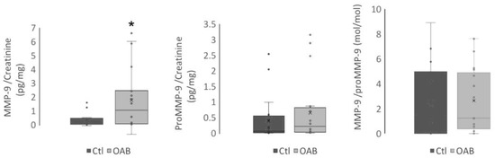 Additionally, enzymatic activity of MMP-9, one of the main enzymes converting proBDNF to BDNF, was higher in the OAB group: 0.325 ± 0.124 vs. 1.802 ± 0.481 ng/mg creatinine in control and OAB group, respectively, p = 0.035 (Table 2). MMP-9 and its precursor proMMP-9 enzymatic activities were also plotted to further assess this trend (Figure 4). The ratio imbalance suggested an increased conversion of proBDNF to BDNF due to an enhanced activity of MMP-9.