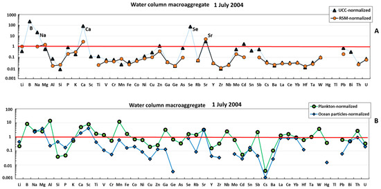 UCC- and RSM-normalized (A) and plankton- and ocean-particle-normalized (B) elemental abundance in the mucilage from the water column. The UCC, RSM, oceanic plankton, and oceanic particles data are from [42,43,44,45], respectively.