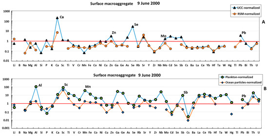 To obtain further insights into the origin of various major and trace elements in the macroaggregates, we normalized the element concentration in the mucilage samples to element concentration in the upper continental crust (UCC, [42]), mean world river suspended matter (RSM, [43]), mean total oceanic plankton (based on >120 original reports in various parts of the world ocean, [44,45]), and mean oceanic particulate suspended mater [44,45]. We consider the oceanic plankton and particulate suspended matter of the water column as the main sources of elements in the mucilage. Here, it is important to note that the phytoplankton contribution to the mucilage composition can be affected by the plankton composition itself. This impact has to be considered during normalization of the elemental composition of the mucilage to that of the plankton. Unfortunately, a full list of major and trace elements in the Adriatic plankton is not available, and there are only limited data on a few trace metals [41]. These concentrations are in reasonable agreement with the world average values as compiled by Savenko [44].
