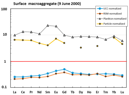 UCC-, RSM-, and plankton- and ocean-particle-normalized [42,43,44,45] rare earth element (REE) pattern in the mucilage from the surface layer.