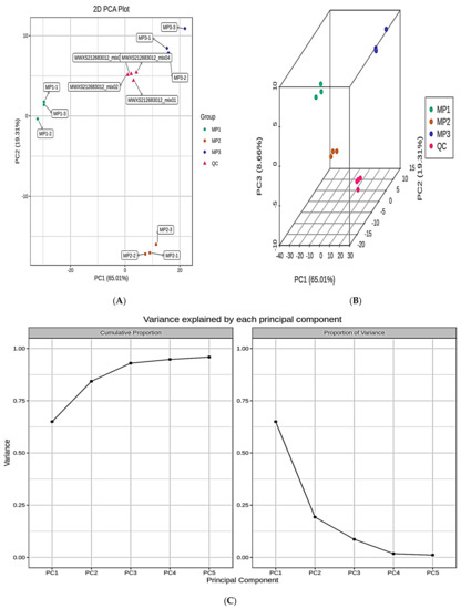 The PCA of all samples (including QC samples) revealed a tendency toward separation for lipid metabolites across the MP1, MP2, and MP3 groups (Figure 2A–C). The PCA plot’s horizontal coordinates reflect the first principle component, the vertical coordinates represent the second principal component, and the percentage represents the principal component’s contribution to the sample variance. Each dot on the plot represents a sample. PC1 of the QC samples was within plus or minus 3 standard deviations (SD) on the principal component univariate statistical process control plot, indicating that the instrument’s condition was stable (Figure 2D). The polar difference method was used to standardize the lipid metabolite content. After normalization, R software was used to perform a hierarchical cluster analysis (HCA) to examine the accumulation pattern of metabolites among the samples obtained (Figure 2E).