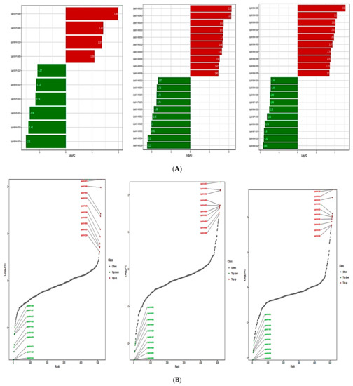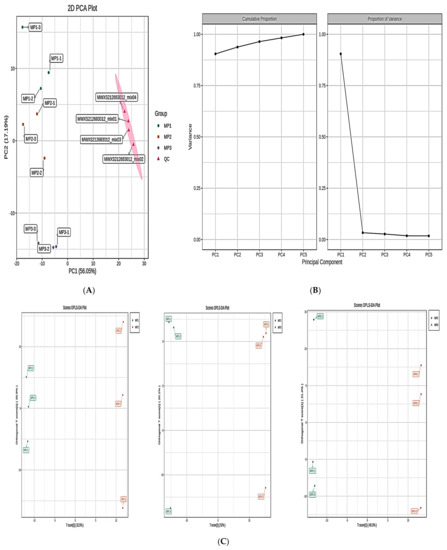 Figure 4 displays the subgroup PCA. The confidence intervals of the PCA plots are shown by the ellipse in Figure 4A, where the horizontal coordinate represents PC1 and the vertical coordinate represents PC2. The MP1, MP2, and MP3 groups showed a trend of separation in both dimensions (Figure 4A), which suggests a substantial variation in lipid metabolites between the groups, whereas Figure 4B depicts the explainable variations of the top five main components listed. The vertical coordinates represent the explainable variances, while the horizontal coordinates represent the principal components. Moreover, the right panel displays the explainable variances of each main component, whereas the left panel displays the cumulative explainable variances. An OPLS-DA score plot was used to depict the raw lipidomic data, revealing a clear differentiation between the different stages (MP1, MP2, MP3) (Figure 4C). The red and green dots in the Figure 4D OPLS-DA S-plot represent the metabolites near the upper right and lower left corners, indicating a differential expression (VIP ≥ 1 and VIP < 1). The results from the subsequent permutation tests showed that R2X = 0.808, R2Y = 1, and Q2 = 0.983 (Figure 4E), showing that the plots functioned uniformly in terms of predictive performance.