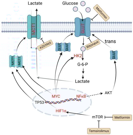HK2 is a vital member of the HK family, as the first key rate-limiting enzyme to facilitate glucose to glucose-6-P (G6P) during glycolysis process. It is reported that overexpression of HK2 increases tumor cell glycolysis, and a high level of HK2 is relevant to poor prognosis in DLBCL patients [30]. GLUTs, glucose transporters, can carry and transport glucose across plasma membrane. Their expression and localization are regulated by some factors. For example, nuclear translocation of NF-κB drives transcription of a gene encoding a scaffold that allows AKT phosphorylation to increase GLUT1 localization to the plasma membrane, while tumor protein P53 (TP53), MYC and hypoxia-inducible factor-1α (HIF-1α) upregulate the expression levels of GLUTs and thus lead to greater glycolytic flux in DLBCL [31,32]. MTCs can transfer lactate between different cell types, and are essential for the tumor microenvironment due to high levels of lactate produced by anaerobic glycolysis. Patients with MCT1 upregulation in tumor cells and MCT4 upregulation in stromal cells tend to have poor prognosis. In MYC-amplified lymphomas, MCT1 expression was dramatically increased, which indicates MCT1 expression is regulated by MYC [33,34,35] (Figure 1).