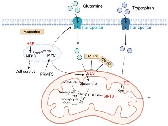 Altered amino acid metabolism and potential drugs in DLBCL. Glutamine is transported by glutamine transporters and then converted into glutamate by GLS. SIRT3 stimulates glutamine dissolution by activating GDH to increase α-KG production, which leads to enhancement of the TCA cycle and thereby generates more ATP to support tumor growth. IDO is a rate-limiting enzyme that catalyzes tryptophan to Kyn and kynurenic acid, which are considered immunosuppressive. PRMT5 promotes transcription of MYC. MYC activates GLS and glutamine transporters. HBP activates the NF-κB signaling pathway. The HBP inhibitor azaserine in DLBCL cells can inhibit the activation of NF-κB, and thereby induce cell arrest and apoptosis. BPTES is a selective allosteric regulator of GLS1 that attenuates the growth of lymphoma xenografts and delays MYC-driven tumor proliferation. Another GLS inhibitor, CB-839 inhibits the conversion of glutamine to glutamate. Kyn, catalyzed by IDO1 from tryptophan, is considered immunosuppressive. Molecules in red represent upregulation in DLBCL. GLS: glutaminase; SIRT3: NAD-dependent deacetylase sirtuin-3; PRMT5: protein arginine methyltransferase-5; HBP: the hexosamine biosynthesis pathway; ATP: adenosine triphosphate; TCA: tricarboxylic acid; GDH: glutamate dehydrogenase; α-KG: α-ketoglutarate; Kyn: kynurenine; NF-κB: nuclear factor kappa-B.