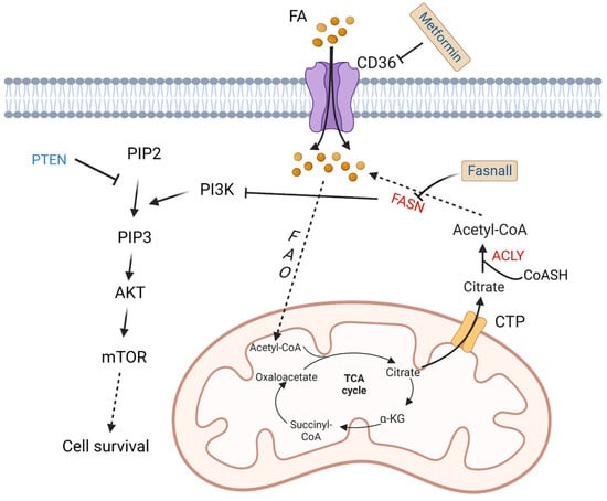 Altered fatty acid metabolism and potential drugs in DLBCL. Fatty acids are transported into DLBCL cells via CD36. Fatty acids are finally converted to acetyl-CoA by a series of oxidation reactions and enter the TCA cycle. A product in the TCA cycle, citrate is transported out of mitochondria by CTP. In cytoplasm, citrate and CoASH are converted to acetyl-CoA catalyzed by ACLY. FASN, the key enzyme in fatty acid synthesis, inhibits the activation of PI3K. PI3K phosphorylates PIP2 to PIP3, and then activates AKT/mTOR pathway to promote cell survival. On the contrary, PTEN dephosphorylates PIP3. Fasnall is a selective FASN inhibitor. Metformin is an inhibitor of CD36. TCA: tricarboxylic acid; FAO: fatty acid oxidation; FASN: fatty acid synthesis; α-KG: α-ketoglutarate; ACLY: ATP-citrate lyase; PYR: pyruvate; CTP: citrate transporter protein; PTEN: phosphatase and tensin homologue; mTOR: metabolic regulator mammalian target of rapamycin; CoASH: coenzyme A. PIP3: phosphatidylinositol 3,4,5-trisphosphate; PIP2: phosphatidylinositol 4,5-bisphosphate.