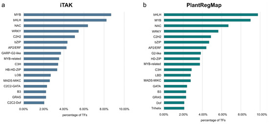 TF families detected in the B10v3 genome by the iTAK (a) and PlantRegMap (b) databases, which account for more than 2% of all identified TFs.