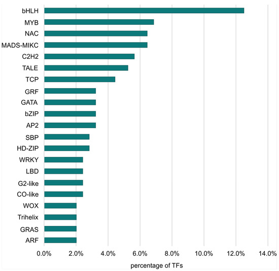 In order to obtain a complete view of the TFs across the genome, we carried out a whole genome analysis using B10v3 as a reference. Using the PlantRegMap and iTAK databases, it was possible to find TFs in the B10v3 cucumber reference genome. The results of the matching between the databases differed slightly, but for the most part, they remained consistent with each other. Based on the consensus rules for TF prediction and classification with the use of data from the PlantTFDB database, the iTAK database was created [6]. Annotations from the iTAK database were therefore used in the analyses. Using the “TF prediction” tool available in the PlantRegMap database, 1045TFs were assigned to the searched amino acid sequences. The same input file was used to search for TFs in the iTAK database, allowing for the annotation of 1082 TFs, 1355TRs and 656 PKs in the B10v3 genome. Assigning annotations from the CIS-BP database identified 973 TFs in the B10v3 genome. Of the 16,104 sequences in the B10v3 genome, 14,269 sequence identifiers were assigned from the PlantRegMap database (Supplementary Table S1). TF search results from the PlantRegMap, CIS-BP, and iTAK databases were added to the B10v3 genome annotation and supplemented with TR and PKs search results. The resulting B10v3 genome annotation is provided in Supplementary Table S2. For the results obtained using the PlantRegMap and iTAK databases, the percentage of detected TFs in genomes per family is shown in Figure 2. The prepared annotation of the B10v3 genome, supplemented with information on genes encoding TFs, RFs, and PKs, enriches the knowledge of the genome of the B10v3 cucumber line. The number of TF families detected in the cucumber genome corresponds to TFs detected in other plants [10]. The distribution of the identified genes is consistent with the factors detected in other plants, where the main TF families are MYB, bHLH, NAC, and WRKY [15].