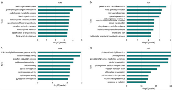 The results of the GO term enrichment analysis, including the results of the statistical testing, can be found in Supplementary Table S4. For DEGs, an overrepresentation of GO terms was found in all comparisons—LvS, FvH, FvM, and MvH—as shown in Figure 5. For FvH, most of the GO terms were related to processes such as pollen sperm differentiation, male gametogenesis, or microgametogenesis differentiation, indicating significant relationships to processes involved in sex determination and male organ formation. In this comparison (FvH), female organs are formed in both female and hermaphrodite flowers, whereas male organs are only present in hermaphrodite flowers.