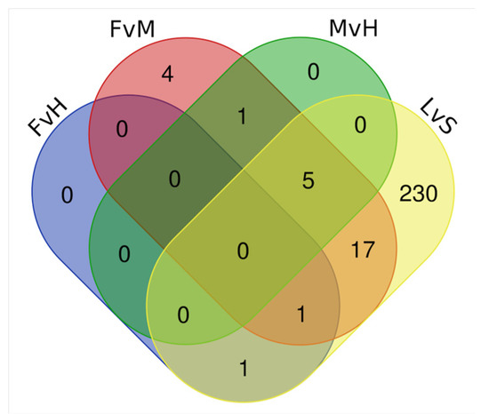 The results of the enrichment step carried out by performing Fisher’s exact tests made it possible to find TFs with significantly overrepresented target genes in the set of genes that were DEGs for the FvM, FvH, MvH, and LvS comparisons. The results obtained are included in Supplementary Table S12, together with additional information on the TF families derived from the created annotation for the B10v3 genome. A summary of the number of enriched TFs that had significantly overrepresented target number for the comparisons studied is shown in Table 2 below.