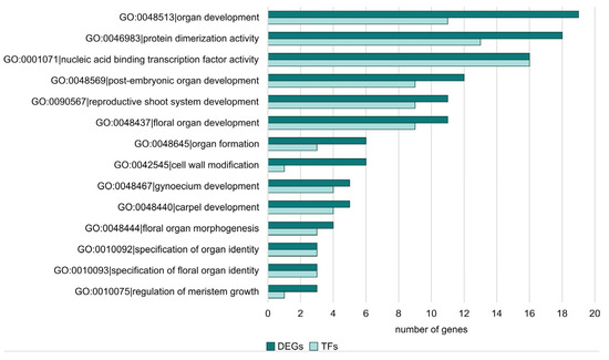 The next step in the analysis was to check whether there were any DEGs in the enriched GO terms that were also TFs. For this purpose, we checked all DEGs in the sex-specific comparisons. In Figure 7, the frequency of TF genes among DEGs for each GO term is shown for the FvM comparison. It can be seen that TFs are responsible for floral developmental processes, carpel development, and organ formation. This indicates the actual involvement of TFs in processes linked to the plant’s sex development. No TFs were detected for the enriched GO terms in the FvH comparison. For the MvH comparison, two TFs involved in gynoecium and carpel development processes were detected among the enriched GO terms. They are also directly related to issues of plant sex development, which, as can be seen, demonstrates the relevance of TFs in this process. The LvS comparison was the most abundant. Therefore, it consisted of the largest number of TFs. The GO terms to which the TFs were assigned were related to metabolic processes and biosynthesis.