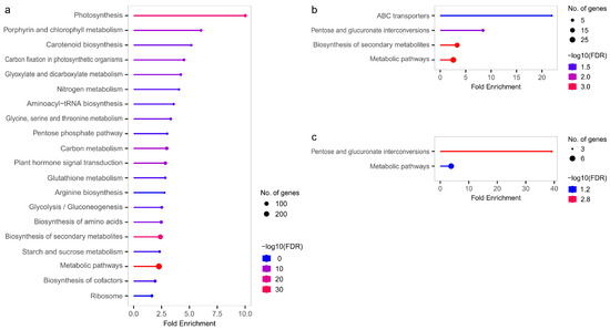 Graphs showing enriched KEGG pathways for LvS (a), FvM (b), and FvH (c) comparisons.