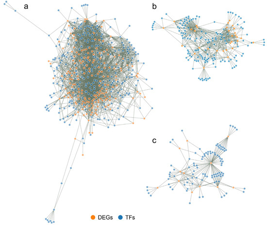 Static image of interactions networks between TFs and DEG targets in the FvM comparison (a), FvH comparison (b), and MvH comparison (c). Orange indicates DEGs, while blue indicates regulatory TFs.