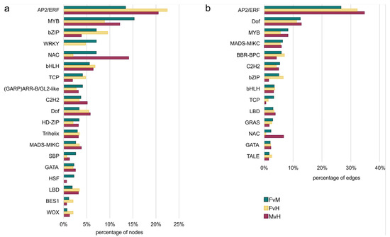 TFs are proteins that help to “turn on” or “turn off” certain genes by binding to the promoter, thereby regulating the functioning of the organism. An analysis of the interaction network identified several TF families that greatly influenced the expression of DEGs in male, female, and hermaphrodite flowers. The most numerous families of regulatory TFs in all three networks were the AP2/ERF (101), MYB (73), NAC (44), bZIP (39), and bHLH (35) families. Other families were less numerous in the sum of the three comparisons (Figure 9). However, some TFs were specified only for one comparison, namely FvM—YABBY, LFY, SRS, and EIL—or only for two comparisons, such as FvH and FvM—WRKY, CPP, and FAR1—and FvM and MvH—the HSF family. In terms of edge numbers, that is, family interactivity, which can be translated into the power to influence DEGs, the most numerous families in the three networks were also AP2/ERF (1069), DOF (465), MYB (296), MADS-MIKC (233), and BBR-BBC (219). Other families possessed fewer than 200 connections. Table 4 presents the top 10 TFs that had the most connections in each interaction network.
