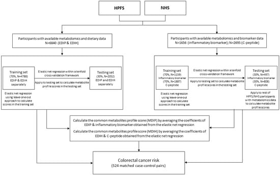 Metabolites are the final product of preceding molecular processes related to genomics, transcriptomics, and proteomics [22,23,24]. Metabolomics is thus uniquely suited to assess metabolic responses to diet. The objectives of the current study were to (1) identify metabolites associated with both the EDIP and plasma inflammatory biomarkers, and both the EDIH and plasma C-peptide, and (2) prospectively examine the association between these metabolomic signatures and the risk of colorectal cancer in a prospective nested case-control study. The hypothesis was that the metabolome associated with both the dietary pattern and corresponding biomarkers(s) may be more robustly predictive of colorectal cancer risk than the dietary-pattern-only metabolome.