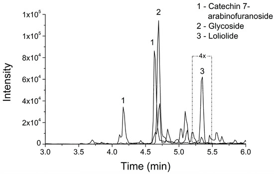LC–MS/MS fingerprint of P. parvifolium hydroalcoholic bark extract (EBHE) showing an extracted ion chromatogram for the ions: (1) m/z 423,13-(2R,3S)-7-[(2S,3R,4R,5S)-3,4-dihydroxy-5-(hydroxymethyl)oxolan-2-yl]oxy-2-(3,4-dihydroxyphenyl)-3,4-dihydro-2H-chromene-3,5-diol; (2) m/z 600,265-2-[[5-(4-hydroxy-3,5-dimethoxyphenyl)-6,7-bis(hydroxymethyl)-1,3-dimethoxy-5,6,7,8-tetrahydronaphthalen-2-yl]oxy]-6-(hydroxymethyl)oxane-3,4,5-triol; (3) m/z 197,116-loliolide. The whole chromatogram (until 10 min) can be visualized in the Supplementary Materials.