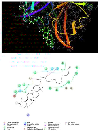 Molecular docking of phytochemicals on appropriate drug target(s) of new diseases provides clues about which plants can be targeted for biological activity screening []. The 3C protease of FMDV (FMDV 3Cpro) is a chymotrypsin-like cysteine protease [,], which is one of the most highly conserved proteins among all picornaviruses, including FMDV. This enzyme plays a crucial role in the viral life cycle by cleaving the picornavirus polyprotein into functional mature structural and non-structural proteins []. FMDV 3Cpro processes 10 of 13 cleavage sites on the polyprotein, making this enzyme an attractive target for anti-viral drugs []. Docking analysis was carried out to investigate the best pose of chosen ligands with the objective protein to gain molecular perception of the inhibitor’s mechanism of binding. Molecular docking analysis using a glide extra-precision module was utilized for investigating the possible molecular interactions accounting for anti-viral activity against picornavirus of the nine isolated compounds. To determine protein–ligand binding and interactions, the studied FMDV 3Cpro structure was modeled using the published three-dimensional (3D) structure of a wide-type 3Cpro []. The FMDV 3Cpro structure was generated based on the deduced amino acid sequence of FMDV by homology modeling with the PDB ID: 2WV4.pdb using the SWISS-MODEL []. The nine isolated compounds and the reference drugs; the natural anti-viral triterpene, glycyrrhizic acid [], and the anti-viral synthetic drugs, ribavirin [], were rated based on their extra precision docking scores. As a result of the in silico docking experiments, the screened compounds were arranged based on their docking scores (Table 5). The molecular docking studies revealed a strong binding of the discovered hits within the active site of FMDV 3Cpro. The highest active compound shown by docking XP g score was Rhazyin A (α-Amyrin 3-(3′R-hydroxy)-hexadecanoate).