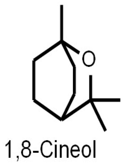 - Cai, Z.M.; Peng, J.Q.; Chen, Y.; Tao, L.; Zhang, Y.Y.; Fu, L.Y.; Long, Q.D.; Shen, X.C. 1,8-Cineole: A review of source, biological activities, and application. J. Asian Nat. Prod. Res. 2021, 23, 938–954. [Google Scholar] [CrossRef] [PubMed]