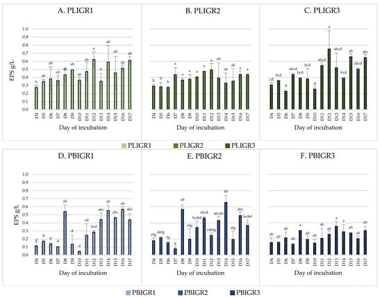 Dynamics of EPS (g/L) synthesis by Plenodomus lingam (PLIGR1, PLIGR2, PLIGR3) and Plenodomus biglobosus (PBIGR1, PBIGR2, PBIGR3) strains during the culture growth period of 4–17 days. Statistical data analysis: one-way ANOVA with post hoc Tukey’s HSD test, p < 0.05. Bars with the different letter are statistically significantly different from each other. Standard deviations are shown as deviation bars (n = 3).