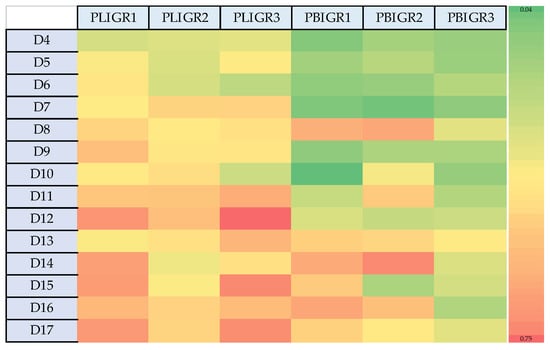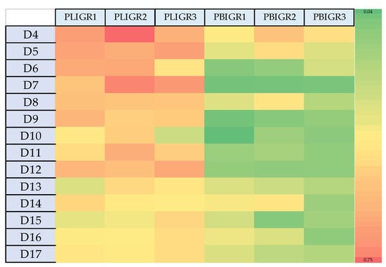 Heat map presenting the differences in the EPS synthesis dynamics between Plenodomus lingam (PLIGR1, PLIGR2, PLIGR3) and Plenodomus biglobosus (PBIGR1, PBIGR2, PBIGR3) species during the 4–14-day culture growth. The colour intensity on the heat map corresponds to the EPS g/L synthesis efficiency.