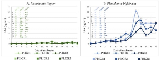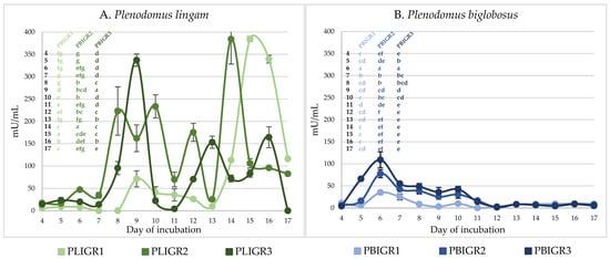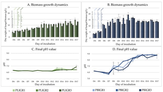 The increase in the biomass of P. lingam strains was consistent throughout the culture incubation period, reaching a maximum between incubation days 15 and 17 (Figure 3A). The slowest biomass growth was exhibited by the PLIGR2 strain, where 9.6 g/L of biomass was obtained. For strains PLIGR1 and PLIGR2, the highest biomass growth (12.8–14.4 g/L) was observed on day 17. A similar relationship was observed for the final pH value, where the pH value during the first 11 days of incubation ranged from 6.2 to 6.7. An increase in the final pH value above this level was observed only on day 13 and the following days. Finally, the final pH value remained at the level of slight acidification of the medium, which is characteristic of the stage of intensive growth of filamentous fungi (Figure 3C).