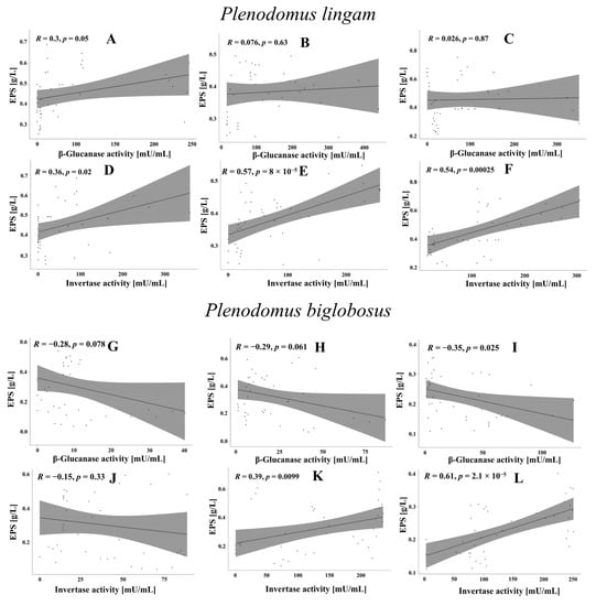 The experiments were carried out in triplicate. The data are presented as the mean value with standard deviation (SD). The results were subjected to an analysis of variance (ANOVA) followed by Tukey’s post hoc test for multiple comparisons at p < 0.05. Correlations between data obtained after the culture (day, pH, biomass, EPS yield, IAA, β-glucanase, and invertase activity) were analysed based on Pearson’s correlation coefficient R. The data were also analysed using PCA (Principal Component Analysis). The statistical analysis was carried out using open-source RStudio for Windows version 2023.03.0 + 386 (Posit, PBC, GNU Affero General Public License v3).