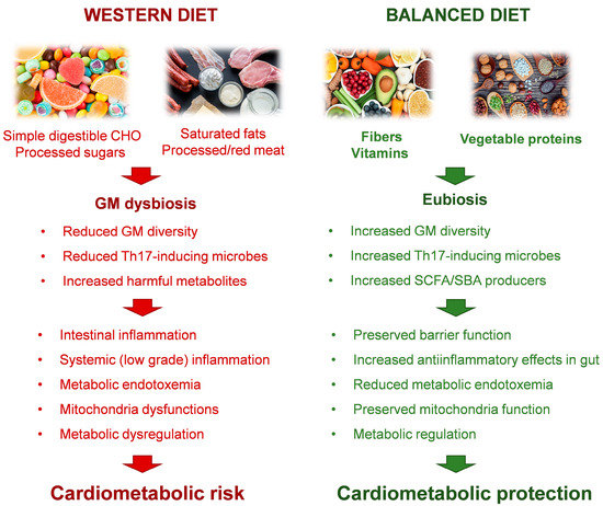 Among the macronutrients, the cardiometabolic effects of dietary CHOs are best characterized (Figure 1). In experimental animal models, simple digestible CHOs, such as sucrose or fructose, both alone and as part of a Western-style high-fat high-sugar diet, cause rapid GM remodeling, inflammation, metabolic dysfunction and arrhythmogenesis [13,14,15,16]. High sugar intake promotes an overgrowth of Proteobacteria in the gut, while simultaneously decreasing the abundance of Bacteroidetes. Given that the latter can mitigate the effects of endotoxin, as well as reinforce epithelial integrity and gut barrier function, high sugar-dependent gut dysbiosis promote metabolic endotoxemia, systemic (low grade) inflammation and the development of metabolic dysregulation. As recently demonstrated, the underlying processes deal with a sugar-driven depletion of Th17-inducing microbes promoted by an outgrowth of Faecalibaculum rodentium [15]. High-fructose diets cause heart–gut axis disorders that promote cardiac arrhythmia through potentiating proinflammatory mediator, such as tumor necrosis factor alpha (TNF-α), nuclear factor-κB (NF-κB), and interleukin 6 (IL-6) [16].