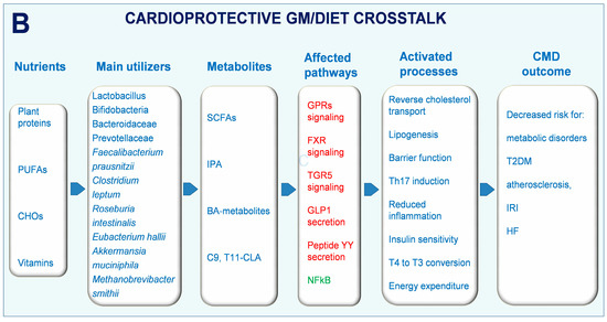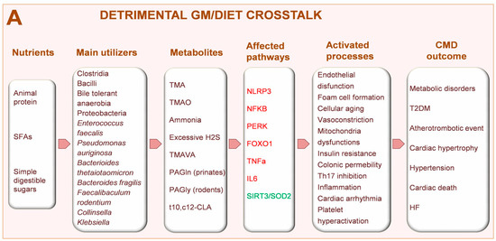 Detrimental (A) or protective (B) consequences of the GM/diet crosstalk on CMD outcome. Activated pathways are indicated in red font while green font refers to repressed pathways. BA: bile acids; CHOs: carbohydrates (non-digestible); CLA: conjugated linoleic acid; FXR: farnesoid nuclear receptor; FOXO1: forkhead box protein O1; GLP1: glucagon-like peptide 1; GPRs: free fatty acid receptors; HF: heart failure; H2S: sulfhydric acid, IL6: interleukin 6; IPA: indolepropionic acid; IRI: ischemia reperfusion injury; NFkB: nuclear factor kappa B subunit 1; NLRP3: pyrin domain-containing-3; PAGln: phenylacetylglutamine; PAGly: phenylacetylglycine; PERK: protein kinase R-like endoplasmic reticulum kinase; SCFAs: short-chain fatty acids; SIRT3: sirtuin 3; SOD2: superoxide dismutase 2; T2DM: type 2 diabetes mellitus; Th17: t helper 17 cells; TGR5: bile acid receptor 1; TMA: trimethylamine; TMAO: trimethylamine-N-oxide; TMAVA: N,N,N-trimethyl-5-aminovaleric acid TNFα.