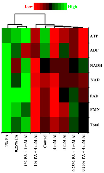 Moreover, both 0.25% and 1% PA treatments under 1 mM Al increased the total ETC metabolites by approximately 0.12-fold and 0.31-fold, respectively, compared to plants exposed to 1 mM Al. The increased total ETC metabolites in the 0.25% PA-treated plants can be associated with increased FMN, FAD, NAD and ATP contents, while that of 1% PA-treated plants is due to high FMN, FAD, NAD, NADH and ATP contents (Figure 4). However, the total ETC metabolites were slightly increased in plants treated with 0.25% PA under 4 mM Al, while 1% PA decreased the total ETC metabolites compared to 4 mM Al alone (Table 1).